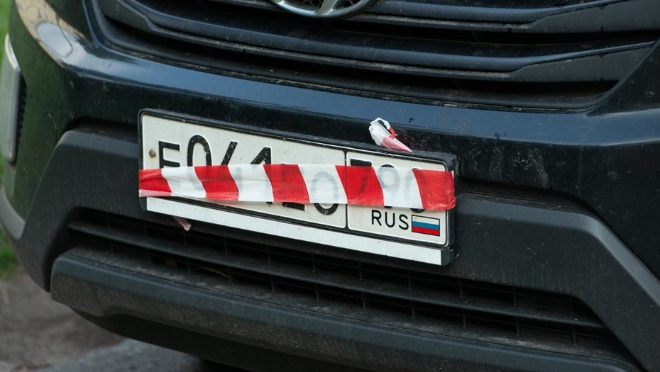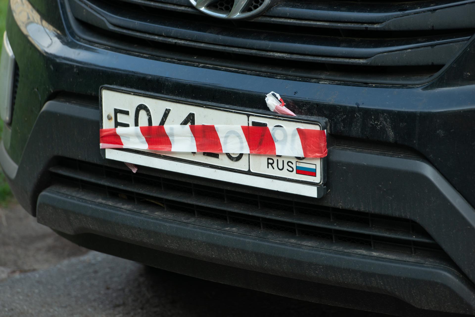 Автовладелец закрыл номерной знак государственной регистрации на автомобиле полосатой сигнальной лентой.