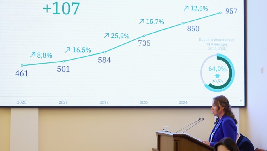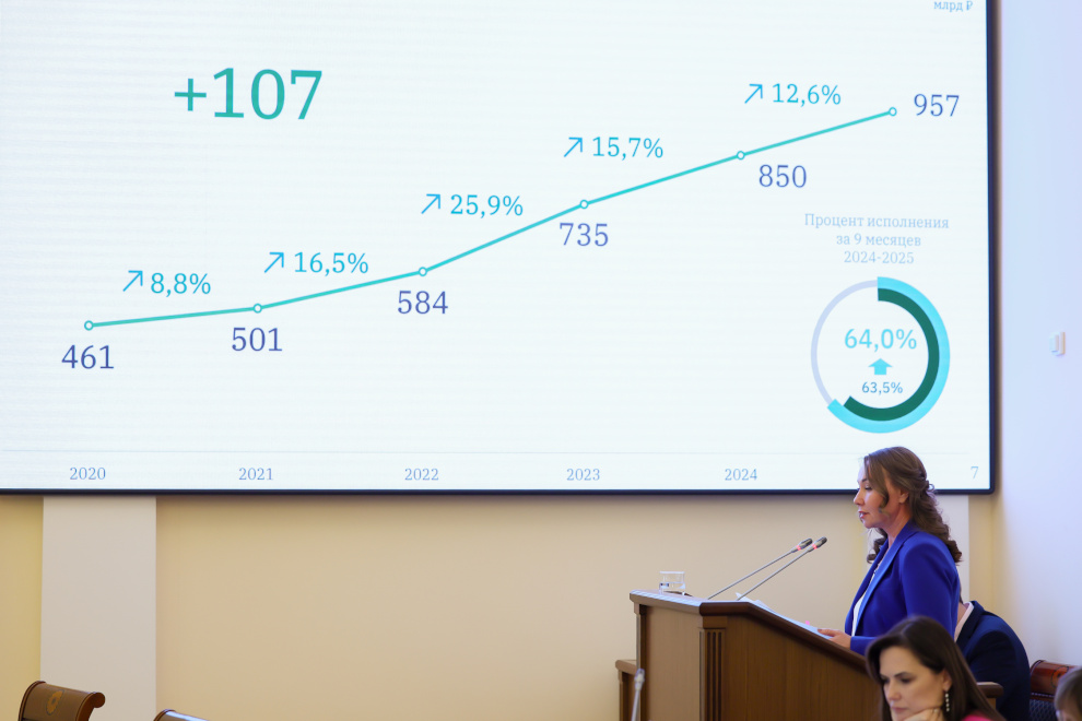За 9 месяцев расходы составили около 957,4 млрд рублей, превышая показатели прошлого года. Из них на развитие и инфраструктуру было направлено около 124,4 млрд рублей, более половины запланированных средств реализуются за счёт федеральных инфраструктурных кредитов.