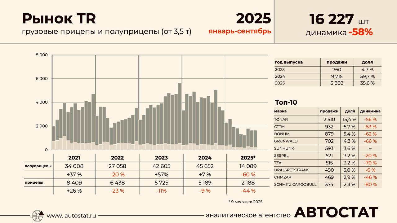 В России с января по сентябрь 2025 года было зарегистрировано 16,2 тыс. новых грузовых прицепов и полуприцепов, сообщил директор "Автостата" Сергей Целиков.