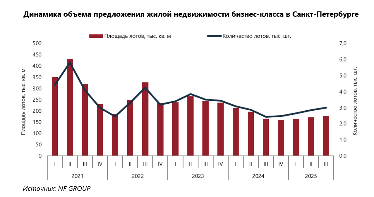 По итогам III квартала 2025 года в Петербурге в предложении было доступно 177,6 тыс. м2 или 3 тыс. квартир и апартаментов.