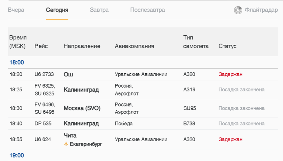 На данный момент есть информация двух рейсов в Ош (Киргизия) и Екатеринбург.