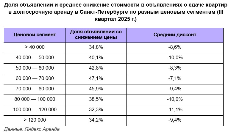Почти 40% арендодателей из Петербурга снижали стоимость квартиры в объявлениях в III квартале 2025-го, по данным "Яндекс Аренда".