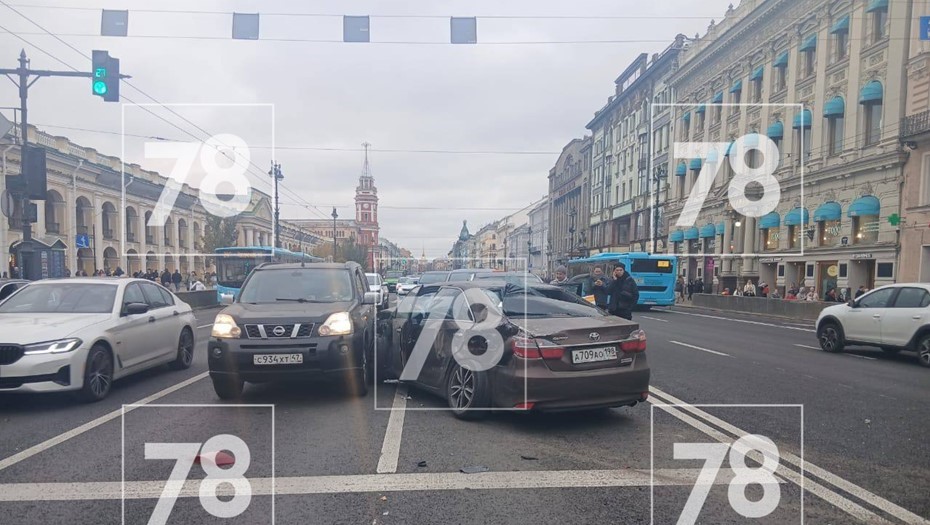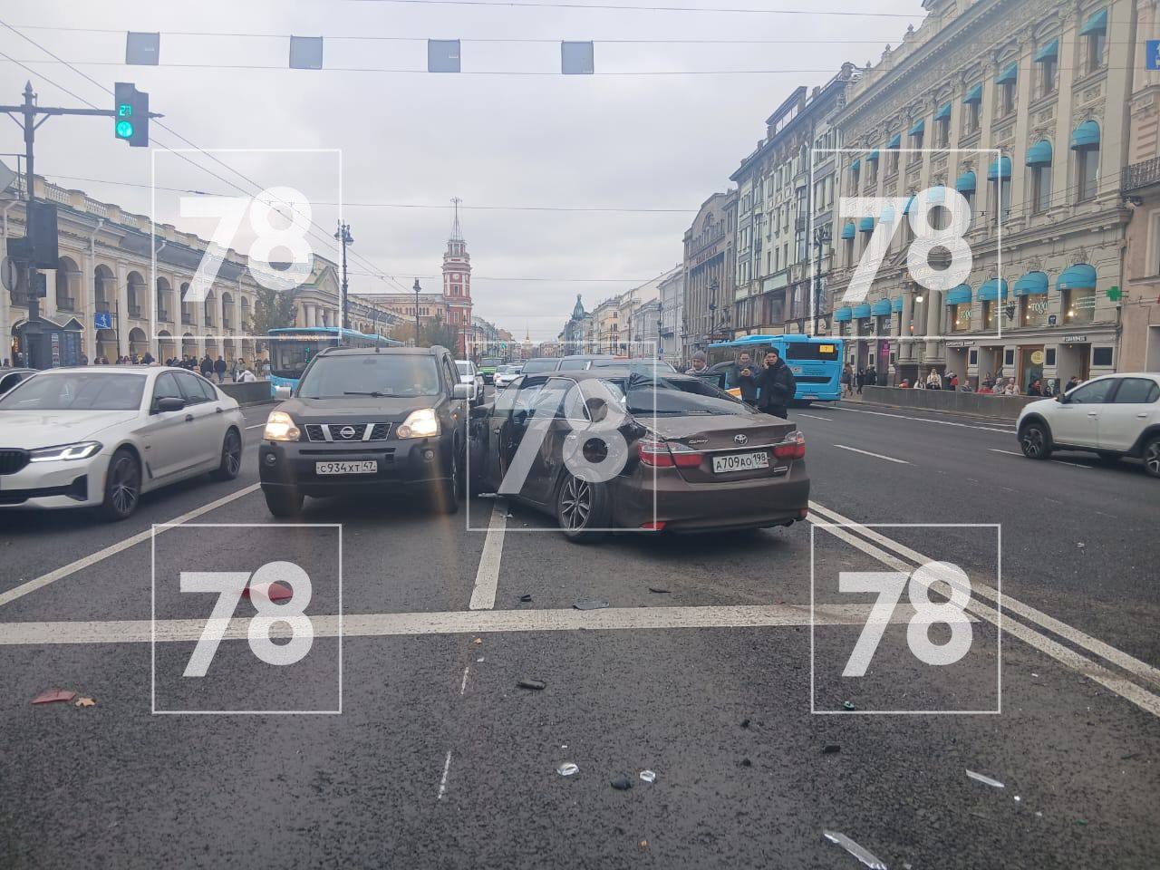 На Невском проспекте в Петербурге произошло массовое ДТП с участием нескольких машин, сообщают очевидцы.