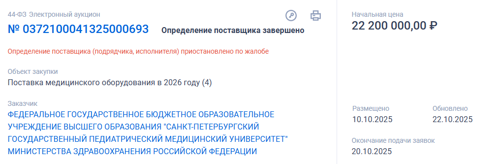Педиатрический университет принял решение об одностороннем отказе от исполнения контракта, обратившись с жалобой в санкт-петербургское УФАС.
