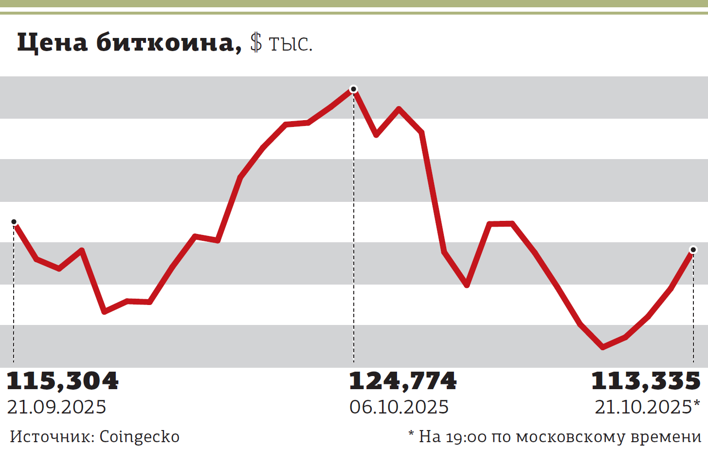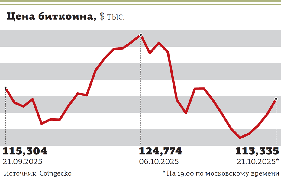 Рынок криптоактивов приходит в себя после распродажи, случившейся в первой половине октября. За прошедшую неделю цена биткоина вновь ходила ниже $105 тыс., но затем бодро отскочила и к 19:00 по московскому времени 21 октября, согласно данным информационного ресурса Coingecko, составляла $113,335 тыс., что на 0,5% превысило уровень недельной давности.