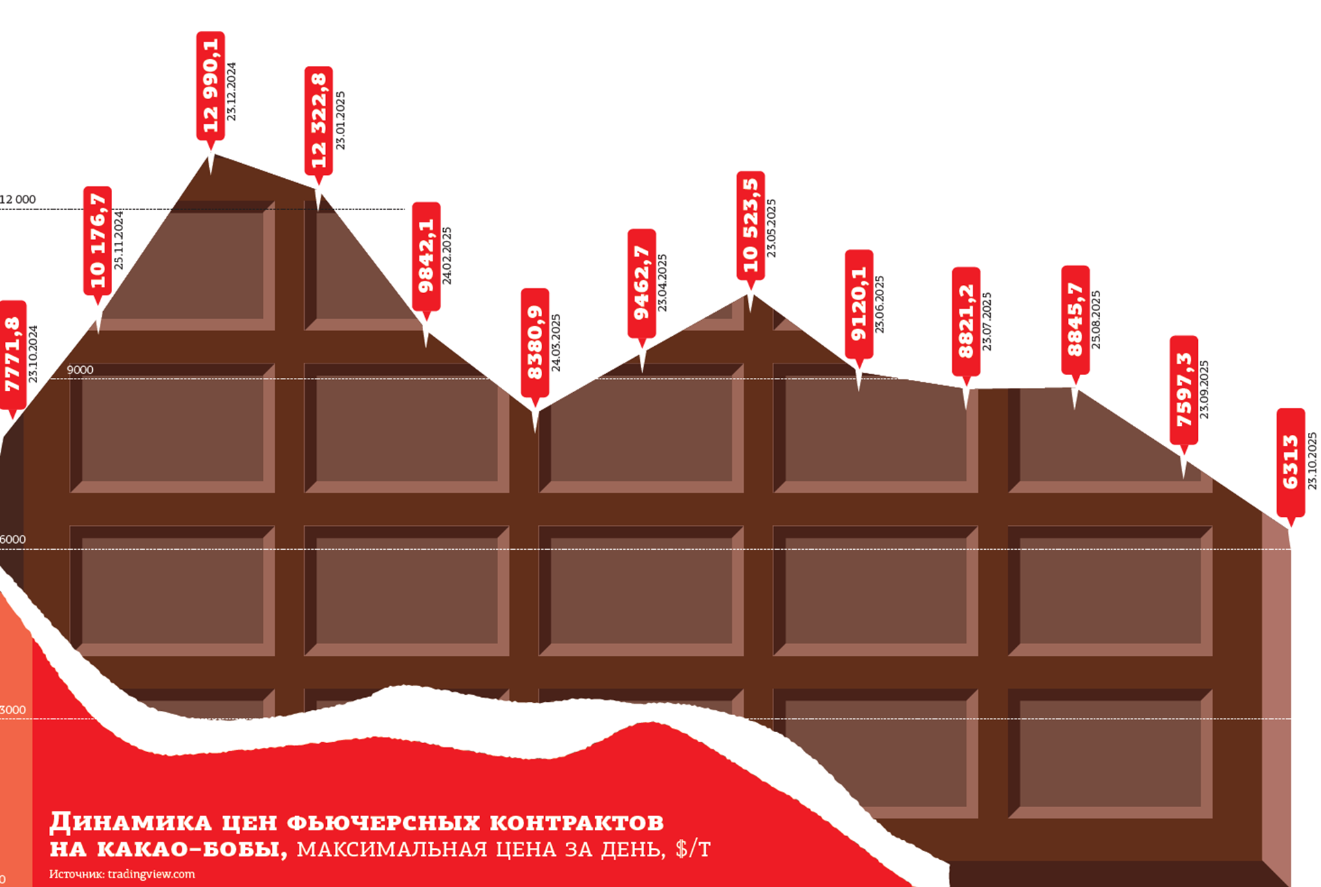 "Эти факторы затрудняют планирование себестоимости и вынуждают корректировать рецептуры. Несмотря на то что мировые цены на какао–бобы в последние месяцы заметно снизились после рекордных пиков, быстрое удешевление шоколада маловероятно. Компании закупили сырьё заранее по более высоким ценам, и эффект от снижения котировок появится только после обновления складских запасов — не раньше чем через несколько месяцев", — комментирует эксперт.