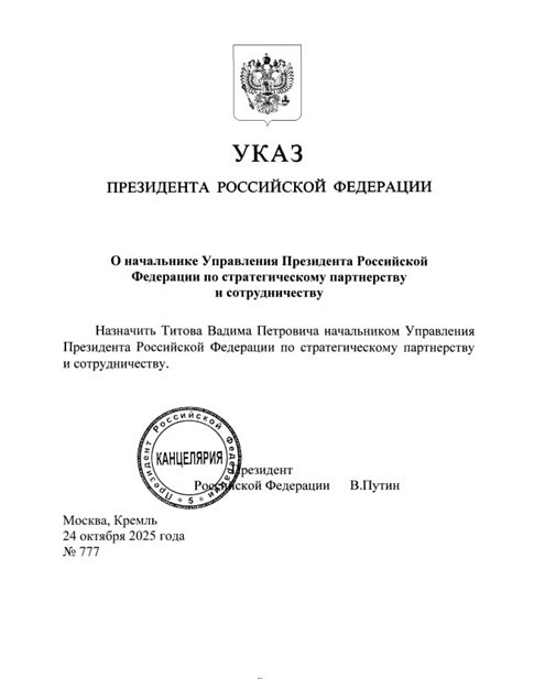 "Назначить Титова Вадима Петровича начальником управления президента Российской Федерации по стратегическому партнёрству и сотрудничеству", — гласит документ.