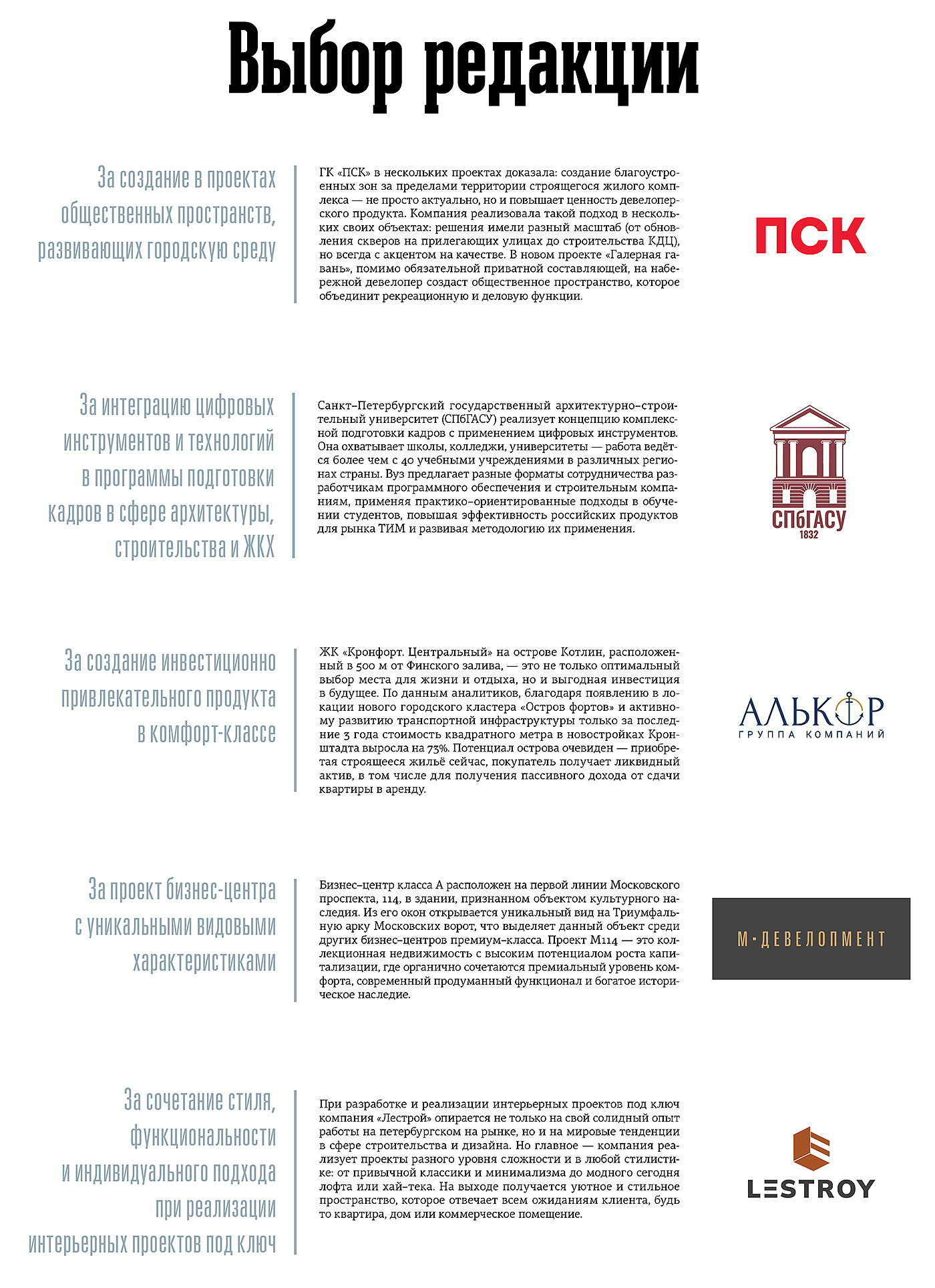 В этом году в голосовании участвовали более 30 экспертов — руководители крупных и влиятельных строительных компаний, брокеры, аналитики и консультанты рынка недвижимости. Проектов в этом году было меньше, чем хотелось бы, но больше, чем ожидали. Девелоперы стали осторожнее, но и требовательнее к себе: меньше спешки, больше расчёта, внимания к деталям и к среде, в которой живёт будущий покупатель. Петербургский девелопмент сегодня — про устойчивость, а не про метры; про решения, а не про скорости.