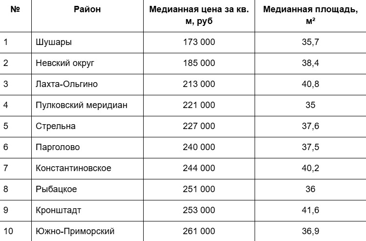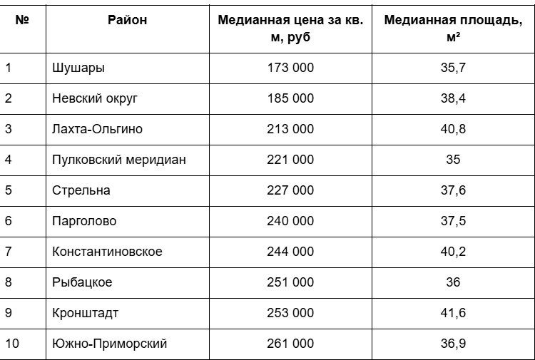 В десятке районов с наиболее доступными квартирами в новостройках оказались Пулковский меридиан (221 тыс. рублей за м2), Стрельна (227 тыс. рублей за м2), Парголово (240 тыс. рублей за м2), Константиновское (244 тыс. рублей за м2), Рыбацкое (251 тыс. рублей за м2), Кронштадт (253 тыс. рублей за м2) и Южно-Приморский (261 тыс. рублей за м2).