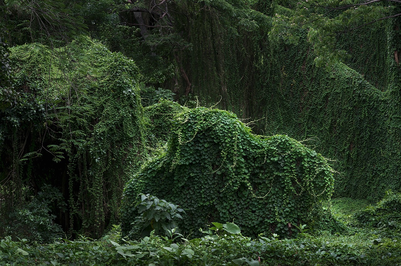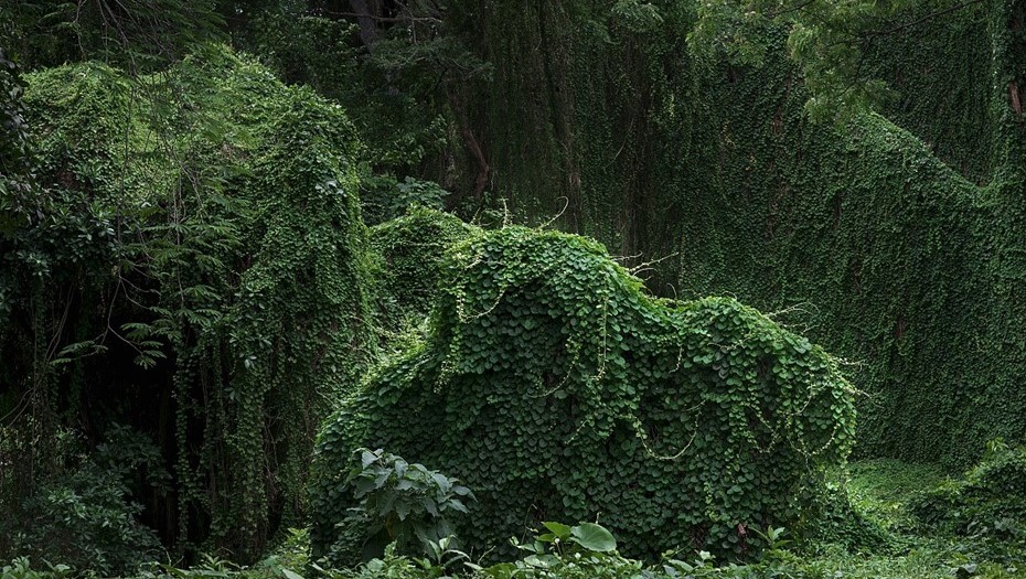 А. К.: В том числе. Необходимо помнить, что мы — не отдельно взятое звено, мы едины с природой. Она может давать нам силы, вдохновение. Но одновременно, если человек не будет проявлять ответственное отношение к ней, природа может его поглотить. Об этом тоже говорят представленные на выставке работы. Например, на многих фотографиях изображено растение кудзу, также известное как пуэрария. Оно было завезено в США с Дальнего Востока, в частности, из Японии. В течение 40 лет американцы активно насаждали его распространение, как неприхотливой и полезной культуры в сельском хозяйстве. Но в какой-то момент стало очевидно, что растение прижилось и начинает размножаться бесконтрольно. Поэтому был установлен биологический контроль за его популяцией на государственном уровне. Таким образом, становится понятно, как неконтролируемое распространение одного чужеродного вида способно необратимо изменить территории, ещё недавно считавшиеся райскими уголками. И это лишь один из аспектов того, как влияет на своё природное окружение человек.