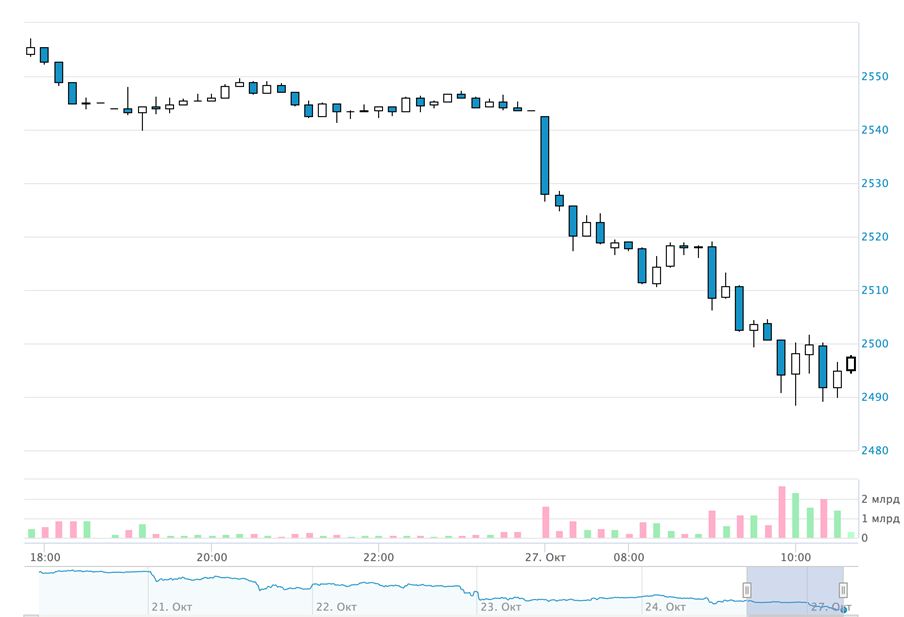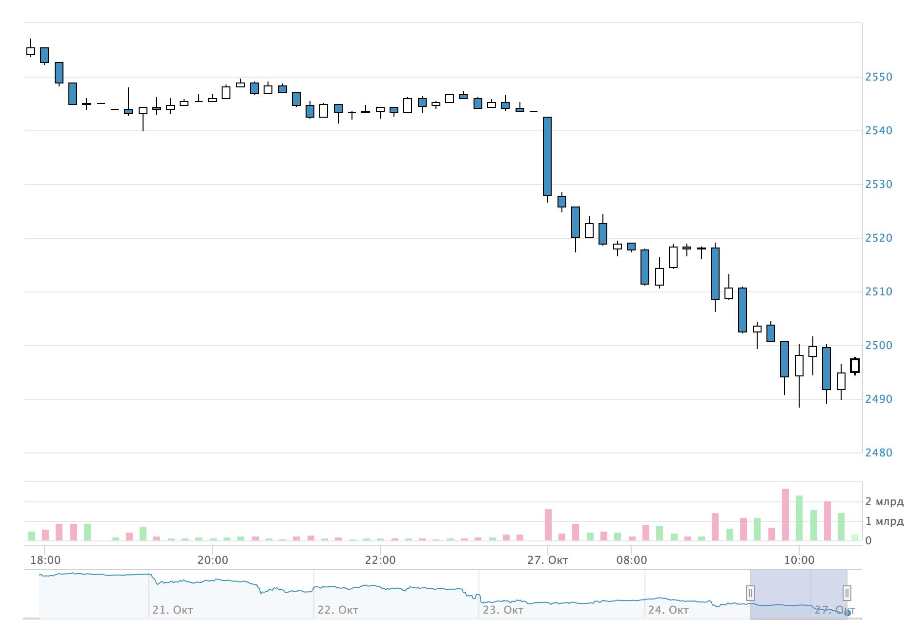 На 9:36 мск индекс снижался на 1,73%, составляя 2 499,45 пункта.