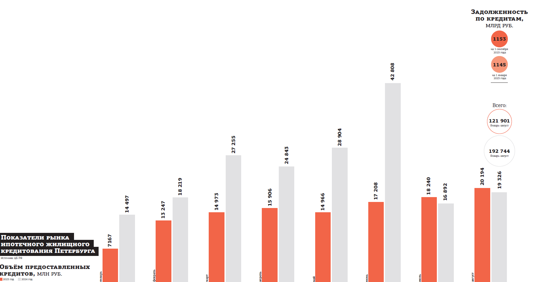 Рынок ипотеки плохо реагирует на текущие высокие ставки. По данным ЦБ РФ, в январе–августе 2025 года в Петербурге было выдано 21,75 тыс. ипотечных кредитов, что на 45% меньше, чем в том же периоде 2024 года. Объём выдач составил 121,9 млрд рублей, снизившись на 37%. Задолженность по ипотеке жителей города на начало сентября составила 1,15 трлн рублей, увеличившись на 0,7% с начала года.