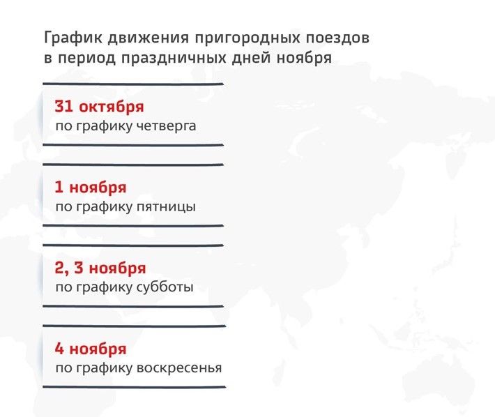 В частности, 31 октября поезда будут курсировать по расписанию четверга, 1 ноября — как в обычную пятницу, а 2 и 3 ноября — по субботнему графику. В День народного единства, 4 ноября, электрички будут ходить как в воскресенье.
