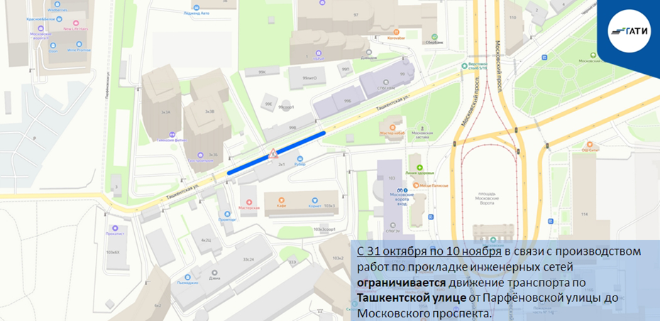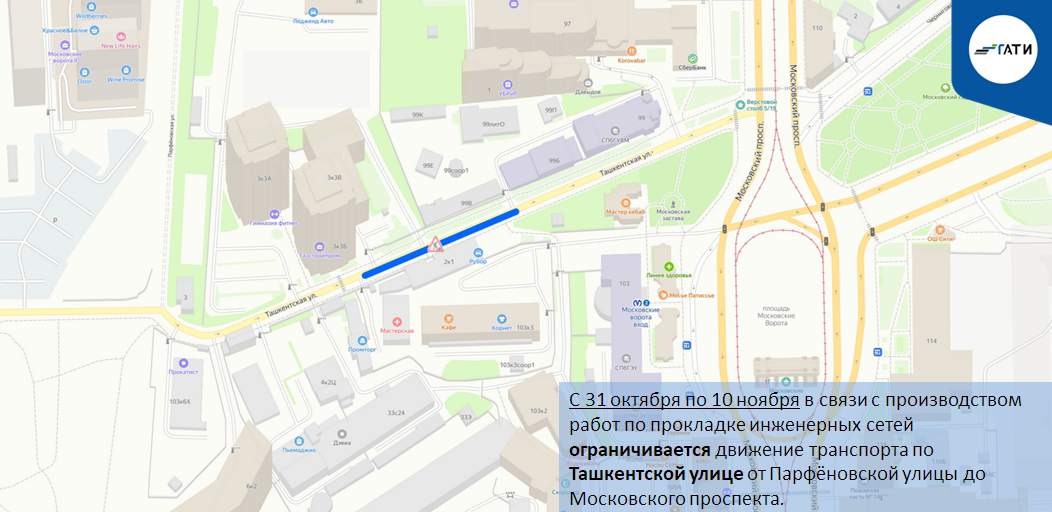 АО "Метрострой Северной Столицы" начинает прокладку инженерных сетей для строительства "коричневой" линии метро на участке от "Путиловской" до "Каретной". Из-за этого ограничат проезд по Ташкентской улице от Парфёновской улицы до Московского проспекта.