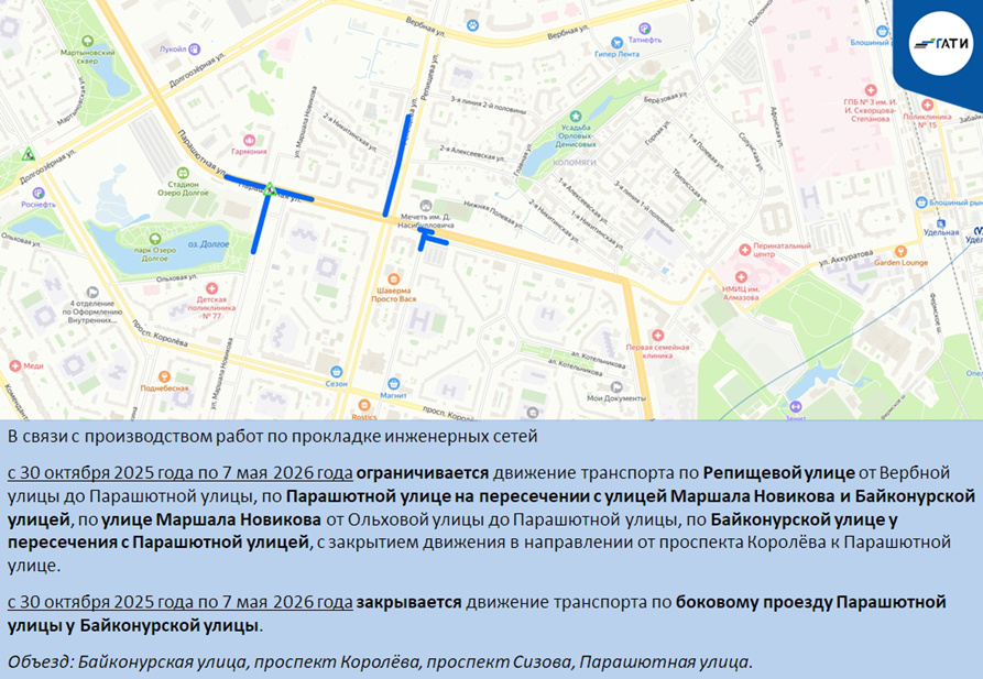 Для объезда предлагается маршрут: Байконурская улица – проспект Королёва – проспект Сизова – Парашютная улица.