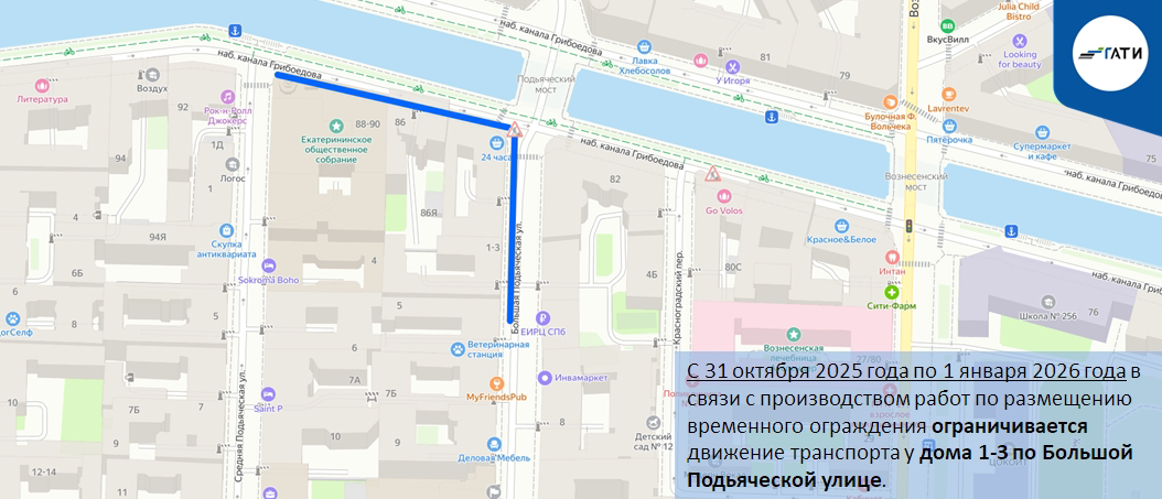 С 31 октября 2025 года до 1 января 2026 года у дома 1–3 по Большой Подъяческой улице ограничат проезд. ООО "Дом Купца Злобина" будет размещать здесь временные ограждения для капитального ремонта фасада одноимённого исторического особняка.