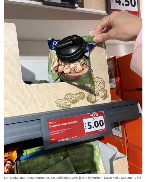 Газета Helsingin Sanomat сообщает, что в одном из магазинов немецкой сети дискаунтеров Lidl в Хельсинки противокражную сигнализацию установили на 250-граммовых пакетах с фисташками, которые продавались по акции по ценее менее чем 5 евро. На других орехах сигнализация отсутствовала.