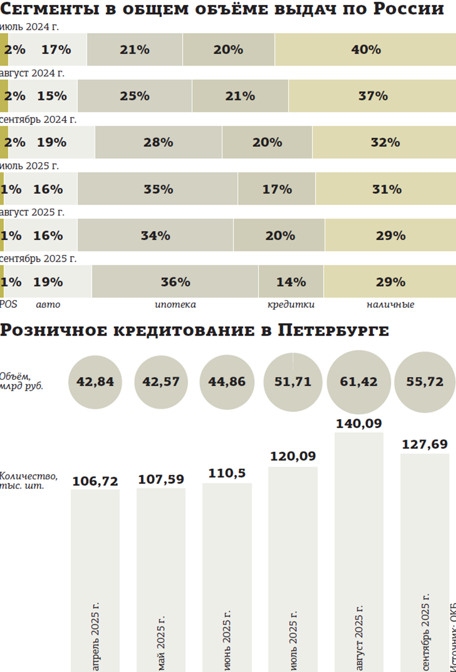 По данным Объединённого кредитного бюро, в сентябре в целом по России количество выдач розничных кредитов сократилось на 7%, объём — на 11%. В годовом выражении общее количество выдач снизилось на 35%, объём — на 22%. В Петербурге за месяц снижение составило 9% и 11% соответственно. Впрочем, август показал самые высокие темпы роста за весь 2025 год (по стране +11% по количеству и +10% в объёмах, в городе +16% по обоим показателям).