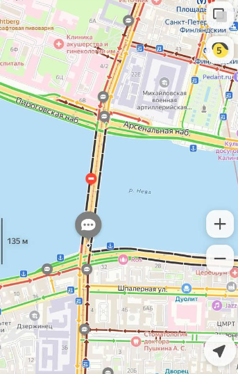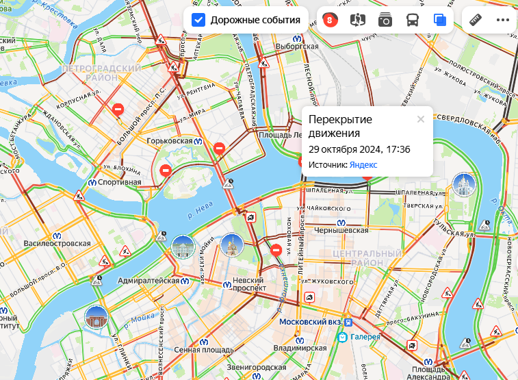 В частности, в комментариях сообщается об остановке движения на Литейном мосту, Воскресенской набережной, Пискарёвском проспекте, проспекте Непокорённых. Отметки и сообщения приходятся примерно на 16.30 по московскому времени, начало вечернего часа пик.