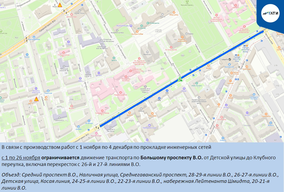 На Большом проспекте В.О. ГУП "Водоканал Санкт-Петербурга" будет прокладывать инженерные сети. С 1 по 26 ноября ограничат проезд от Детской улицы до Клубного переулка, включая перекрёсток с 26-й и 27-й линиями В.О.