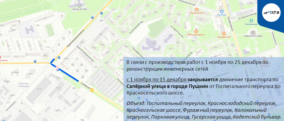 Тем временем в Пушкине в очередной раз закроют Сапёрную улицу, на этот раз на углу с Красносельским шоссе — на выезде из города. ООО "Энергетическое строительство" реконструирует здесь сети для будущего "ИТМО Хайпарка".