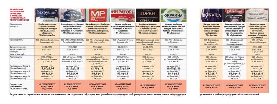Среди колбас "Московская" несоответствия выявлены у ТМ "Мясницкий ряд" из "Дикси" с 12,75% белка и 51,8% влаги; ТМ "Окраина" из "О’КЕЙ" с 15% белка и 55,7% влаги; и ТМ "Дубравицы" из "Верного" с 56,9% влаги.