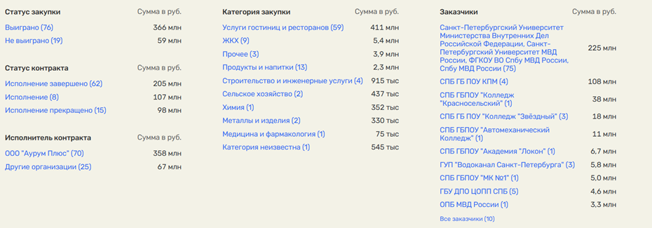 Согласно открытым данным, в портфеле ООО "Аурум плюс" 76 закупок на 366 млн рублей. В топ самых крупных входит контракт с университетом МВД (225 млн рублей), Колледжем петербургской моды (108 млн рублей) и колледжем "Красносельский" (38 млн рублей). Колледж "Звёздный" на четвёртой строчке с 18 млн рублей. Компания работает на рынке с 2009 года и специализируется на организации питания.
