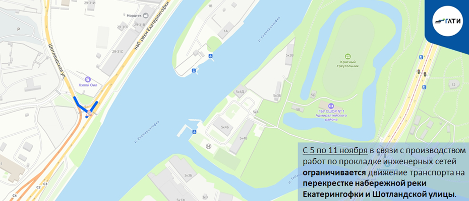 Начинается прокладка инженерных сетей на набережной реки Екатерингофки. В Кировском районе с 5 по 11 ноября ограничат перекрёсток набережной и Шотландской улицы. Работы ведёт ООО "ПетербургГаз".