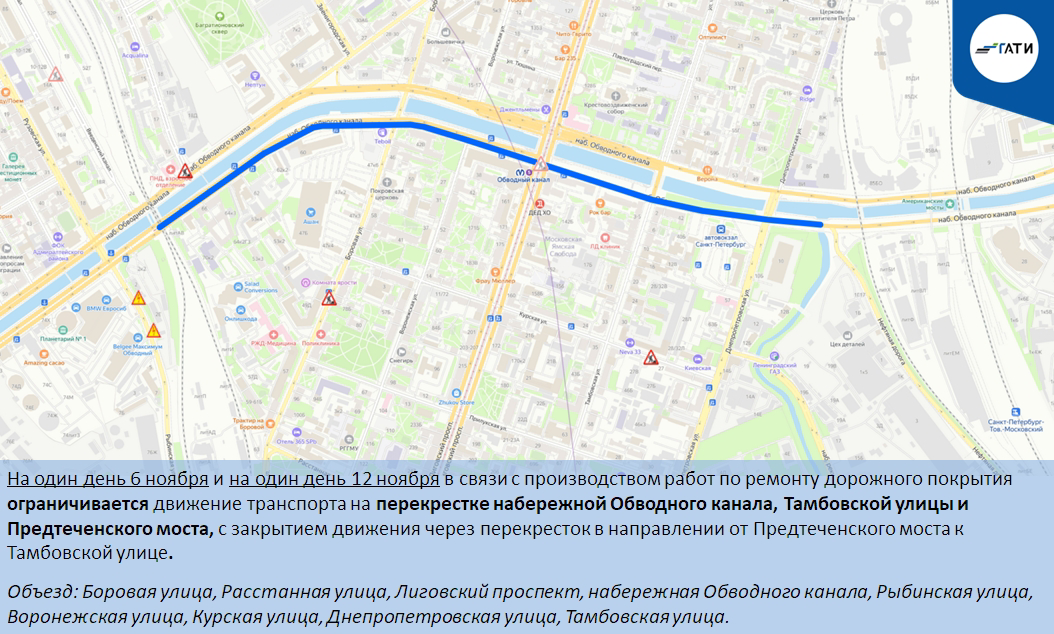 Водители могут объезжать работы по Боровой улице, Расстанной улице, Лиговскому проспекту, набережной Обводного канала, Рыбинской, Воронежской, Курской, Днепропетровской и Тамбовской улицам.