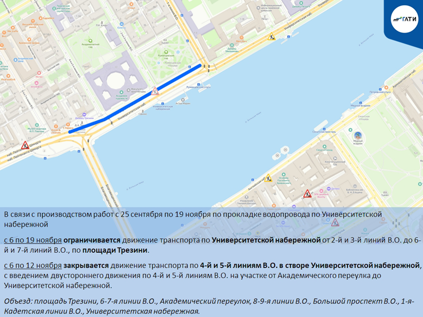 На Университетской набережной снова прокладывают водопровод. С 6 по 19 ноября сузят проезд от 2-й и 3-й линий В.О. до 6-й и 7-й линий В.О., а также по площади Трезини.