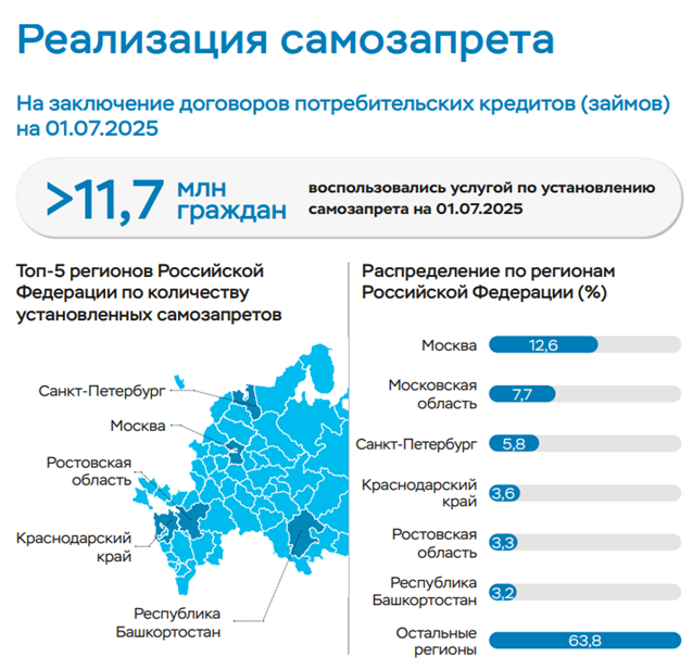 В аналитическом обзоре системы кредитной информации ЦБ РФ по итогам первого полугодия 2025 года сообщается, что уже 5,8 жителей Петербурга оформили самозапреты на кредиты. Таким образом Северная столица наряду с Москвой (12,6%), Московской областью (7,7%), Краснодарским краем (3,6%), Ростовской областью (3,3%) и Республикой Башкирия (3,2%) составил топ субъектов с самой высокой активностью населения в отношении этой услуги.