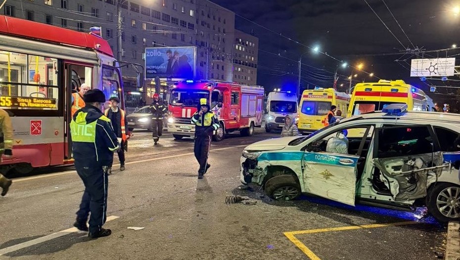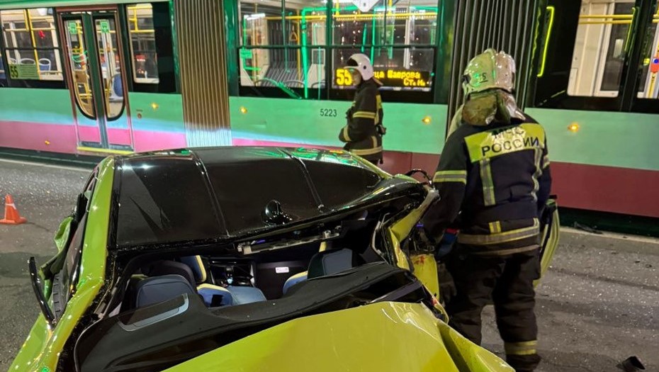 Иномарка на высокой скорости пыталась обогнать лазурный автобус на Политехнической улице, однако водитель спорткара потерял управление и вылетел на встречную полосу. Там автомобиль врезался в полицейскую машину и отлетел под идущий по рельсам трамвай.