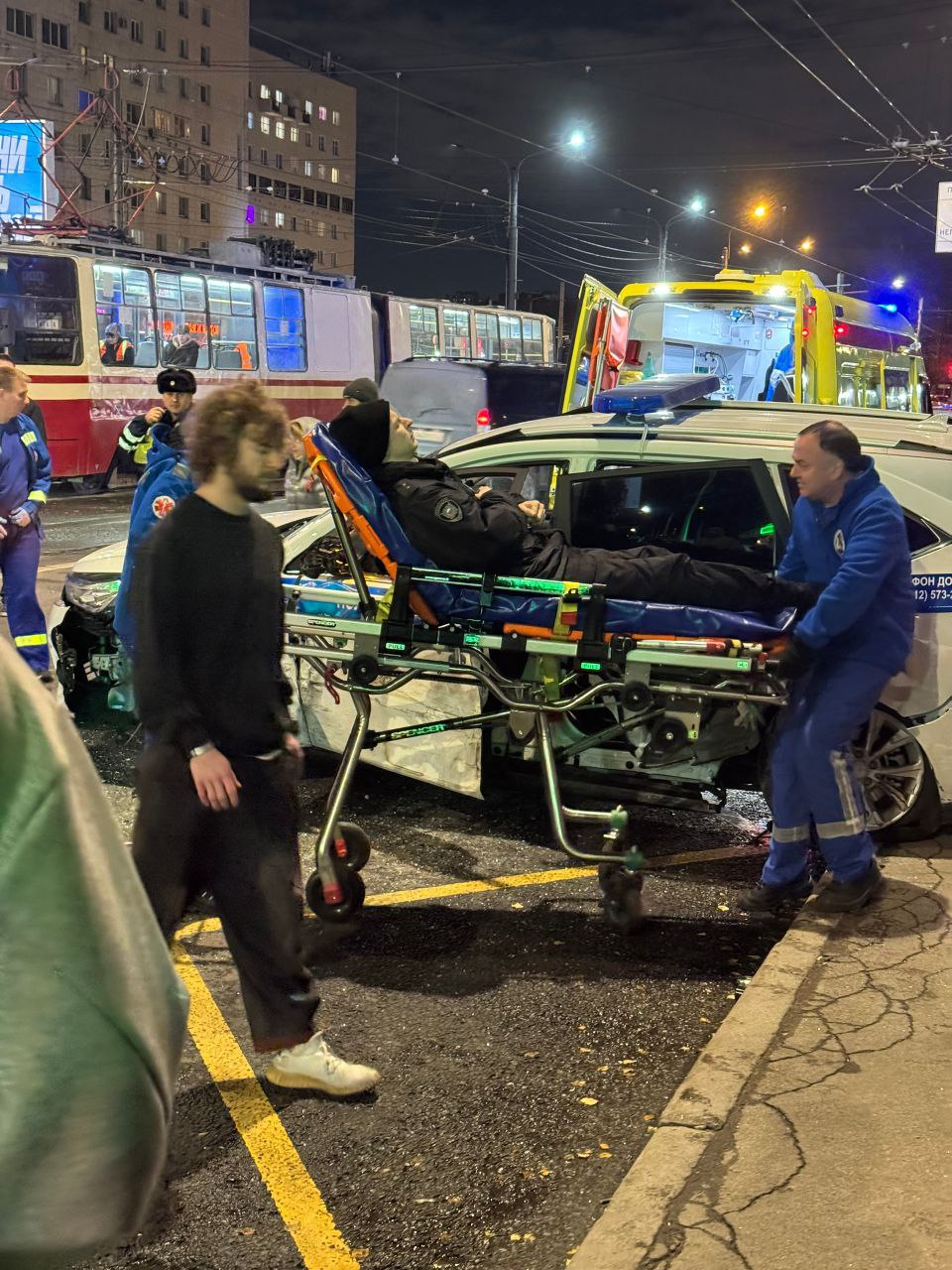 Полицейского пришлось деблокировать из смятой служебной машины. ДТП парализовало движение трамваев. Кадрами с аварии поделились в telegram-канале "Мегаполис".