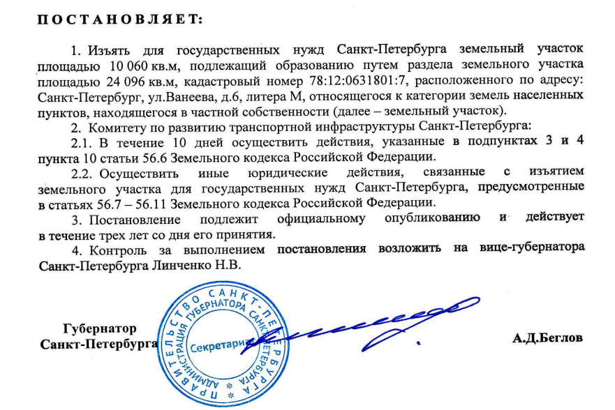 Губернатор Петербурга Александр Беглов распорядился провести изъятие участка от Союзного проспекта до административной границы города, свидетельствуют данные подписанного им постановления.