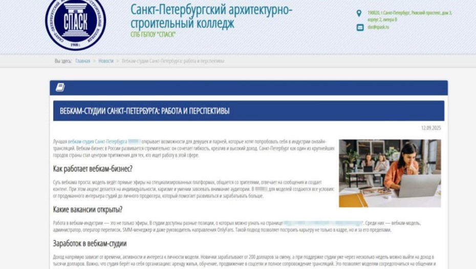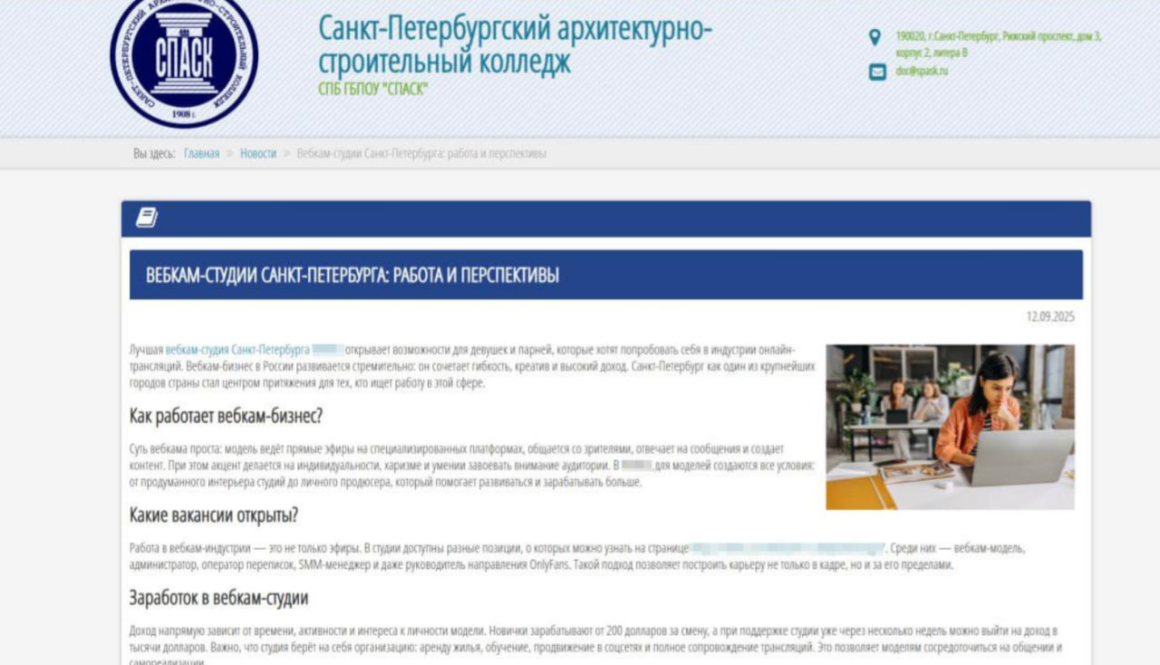 Объявление о работе вебкам-моделью появилось на сайте Санкт-Петербургского архитектурно-строительного колледжа после хакерской атаки, прокомментировали инцидент в комитете по науке и высшей школе города. Техподдержку и хостинг портала учебного заведения осуществляет ООО "Русоникс", колледж направил запрос компании о качестве работы сайта, пишет 78.ru.