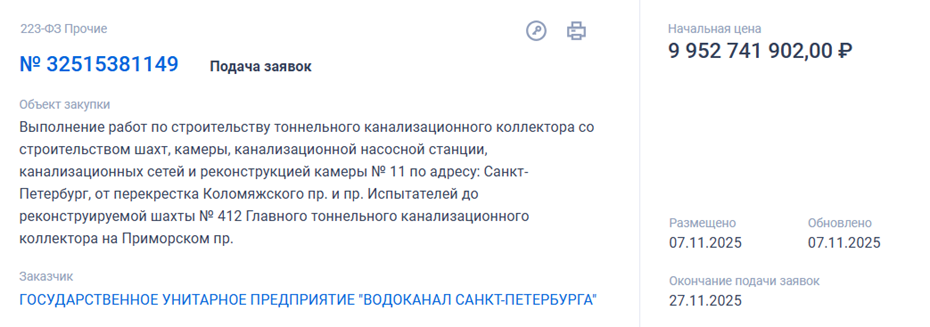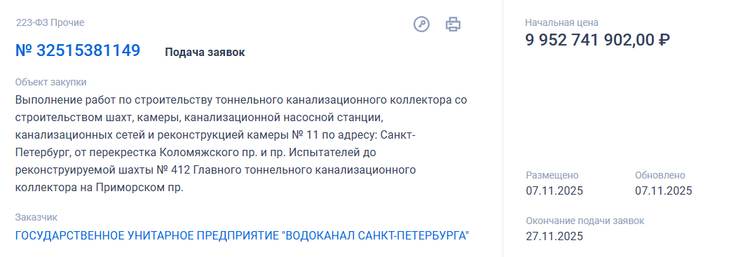 Подрядчику предстоит построить тоннельный канализационный коллектор с обустройством шахт, камеры, насосной станции, канализационных сетей и реконструкцией камеры № 11. Объект будет расположен на участке от перекрестка Коломяжского проспекта и проспекта Испытателей до реконструируемой шахты № 412 Главного тоннельного канализационного коллектора на Приморском проспекте, а заказчик при этом обязуется принять результат выполненных работ и обеспечить оплату по договору в пределах стоимости договора. Работы должны быть завершены до 31 мая 2029 г.