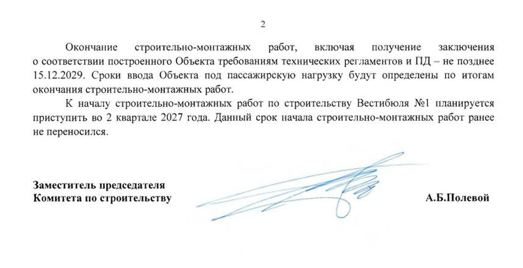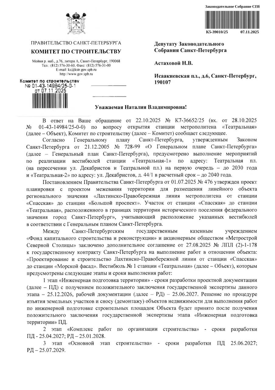 Наталия Астахова опубликовала ответ комитета по строительству на депутатский запрос о сроках строительства "Театральной". Из документа следует, что вестибюль станции Лахтинско-Правобережной линии начнут строить в 2027 году, сдача объекта планируется в конце 2029-го.