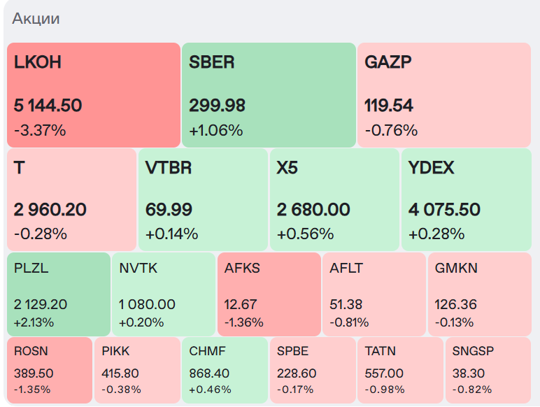 Акции компании "Лукойл" на Московской бирже 10 ноября проседают в цене. На 18:38 снижение составляет -3,37%, до 5144,5 рубля.