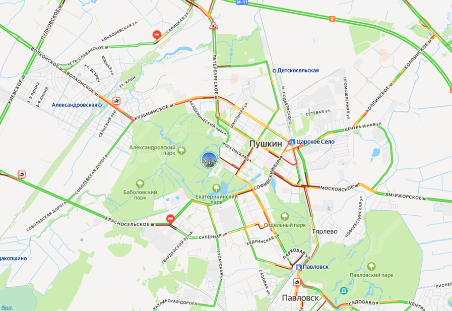 Затем, по данным онлайн-сервиса "Яндекс.Карты", пробки возникли на протяжении всего Павловского шоссе, а также в центре Пушкина: на Софийском бульваре, Конюшенной, Оранжерейной, Средней, Малой, Московской улицах, Октябрьском бульваре. Эти улицы на 18:05 отмечены багровым цветом.