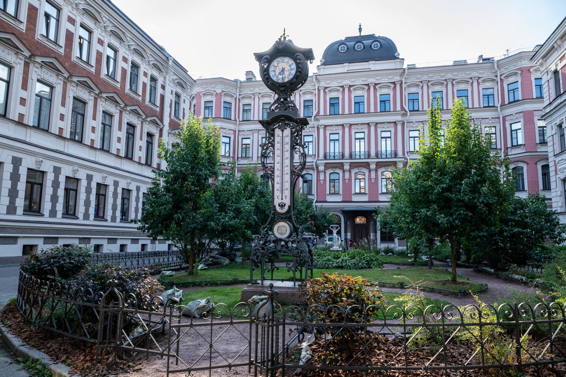 Благоустройство дворов в центральных районах Санкт-Петербурга. Дворик дома Страхового общества "Россия" на Моховой улице, 27-29 был отлично благоустроен до революции. Нынешние буржуазные жильцы пытаются воссоздать часть утраченной красоты и шарма.