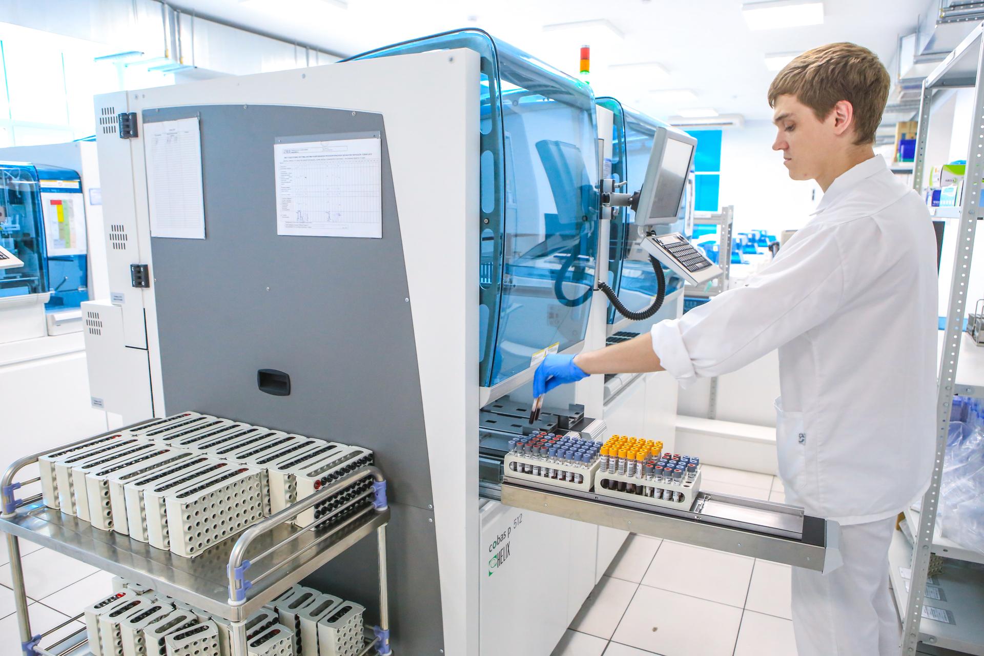 Автоматизированный лабораторный комплекс лабораторной службы Helix, где проводятся исследования для диагностики широко распространенных онкологических, кардиологических, гепатологических и инфекционных заболеваний.