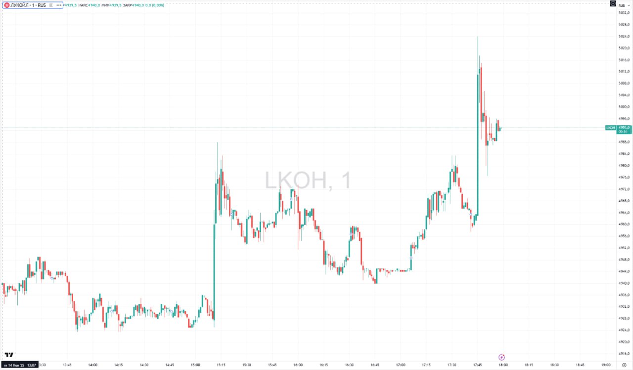Акции "Лукойла" подскочили и превысили 5 тыс. рублей на фоне сообщения компании 14 ноября о проведении переговоров о продаже международных активов.