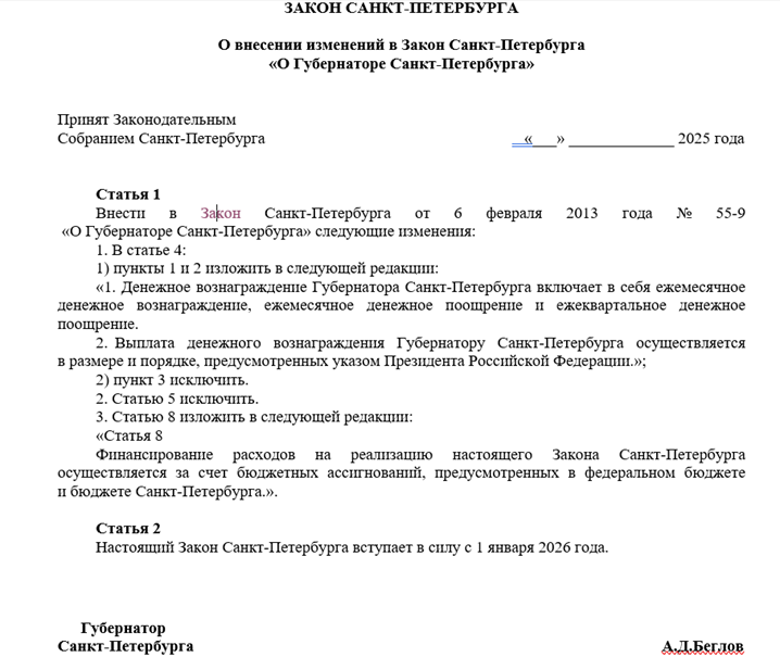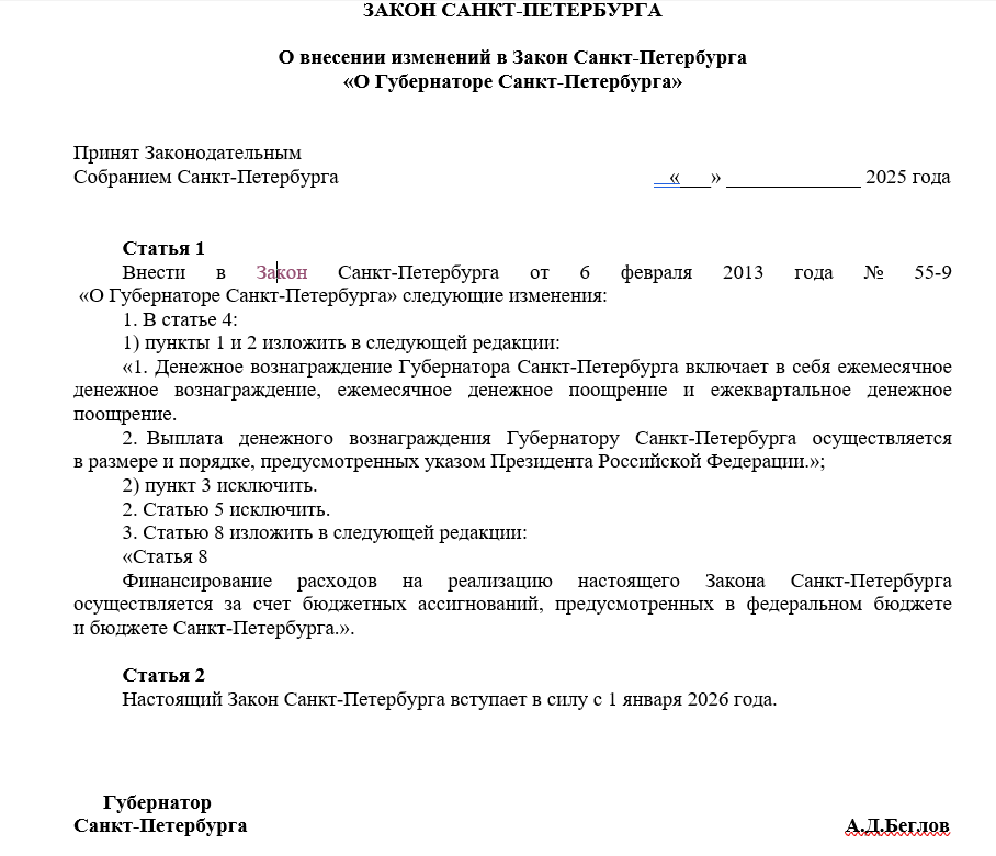 Зарплату губернатора Петербурга изменят с 2026 года, для этого будут внесены изменения в соответствующий закон, указано в документе, представленном для антикоррупционной экспертизы.