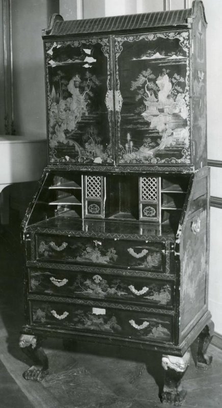 Согласно описанию объекта закупки, предмет мебели сильно пострадал: он в трещинах и сколах, повреждён лак, потёрты росписи, отсутствует значительная часть элементов — ящиков, дверных ручек, ключей и т. д.