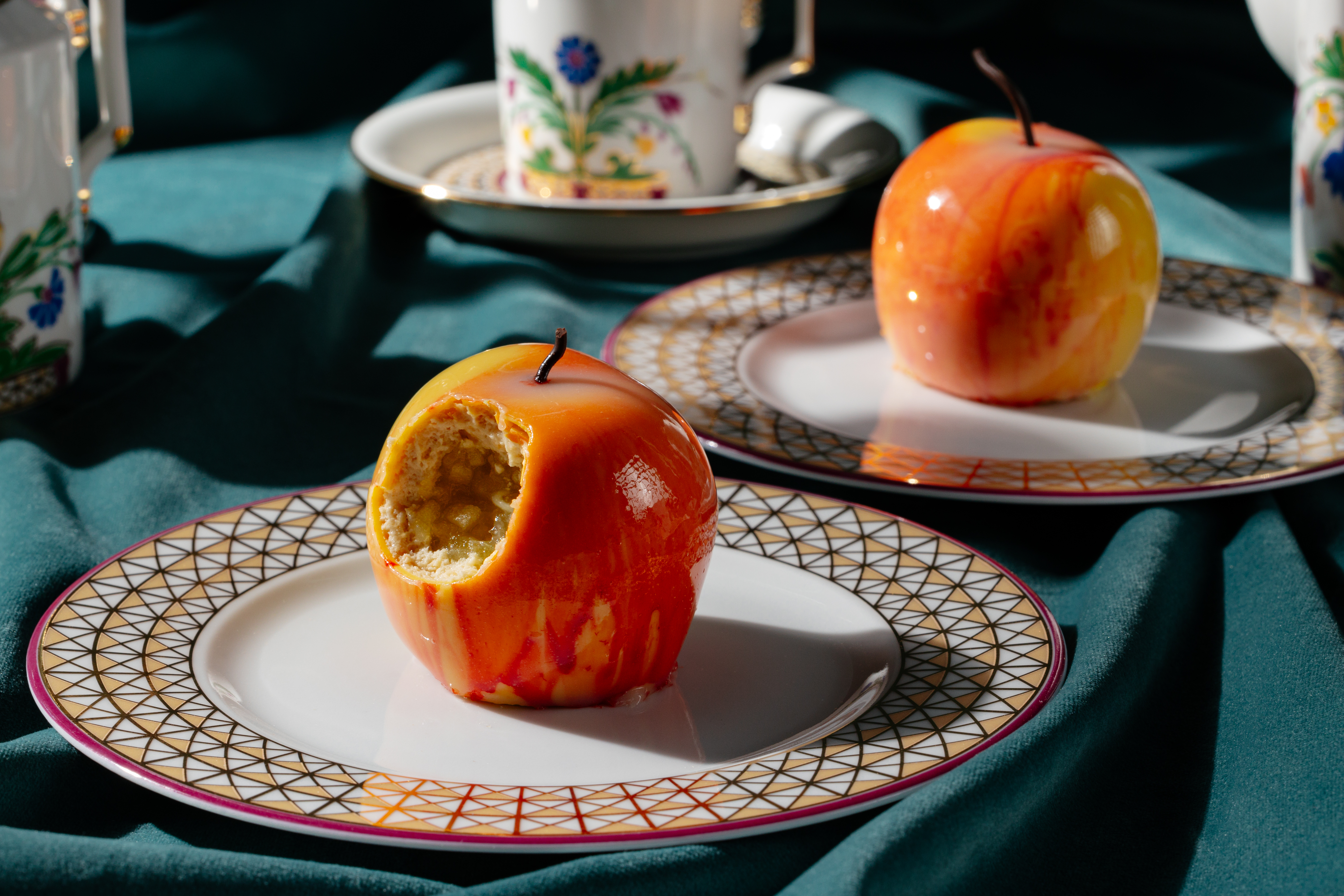 В коллекции есть десерт-метафора "Наливное яблочко на серебряном блюдечке": тонкая шоколадная оболочка с зеркальной глазурью "хрустит" при надломе, внутри — мусс из печёных яблок и тартар с имбирём и лимоном. Подаётся десерт на пищевой бумаге с кистью и красками — гость может сам дорисовать сюжет.