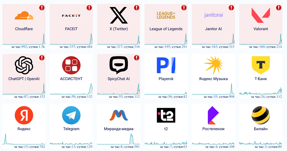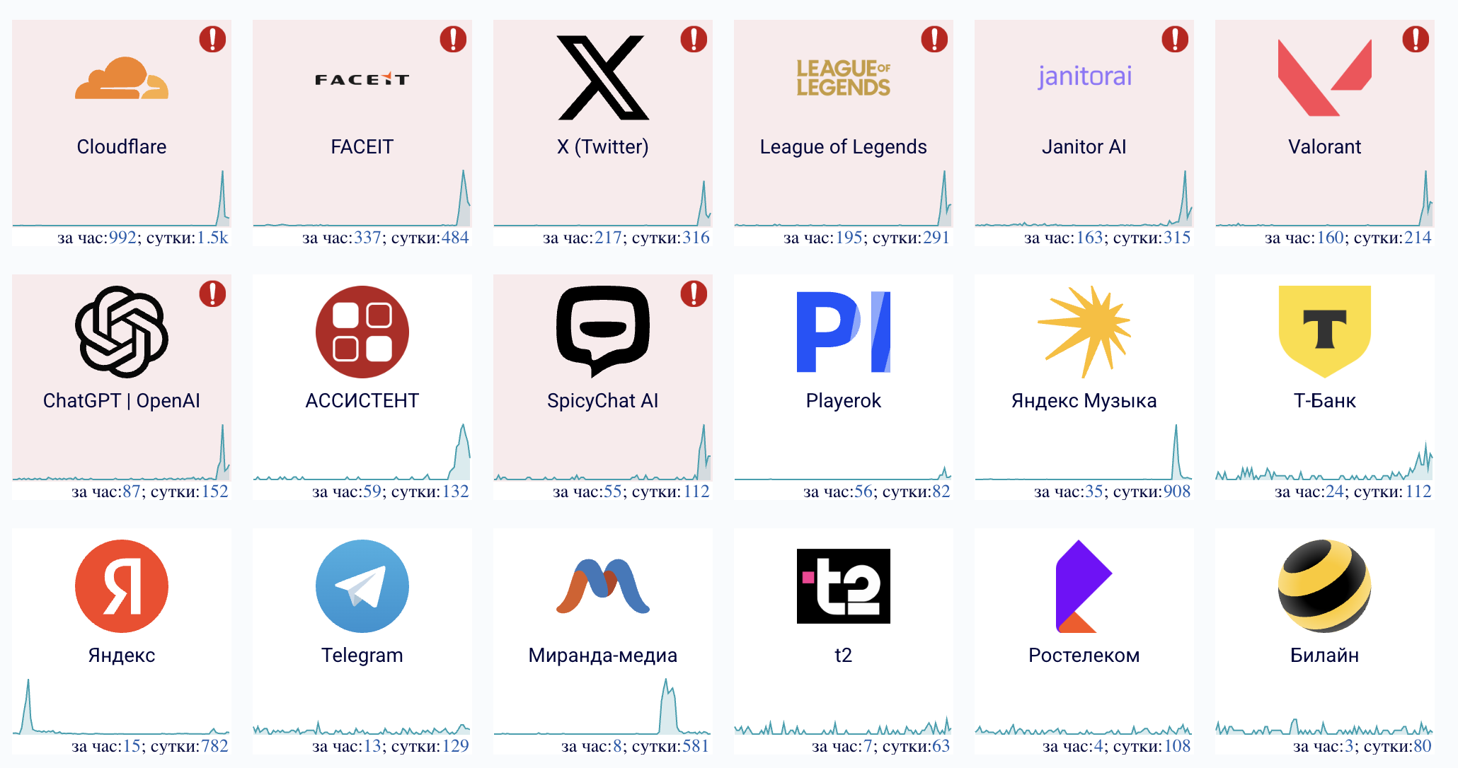 По данным платформы мониторинга сбоев Downdetector, проблемы наблюдались при попытке открыть такие ресурсы, как X (ранее Twitter), Spotify.