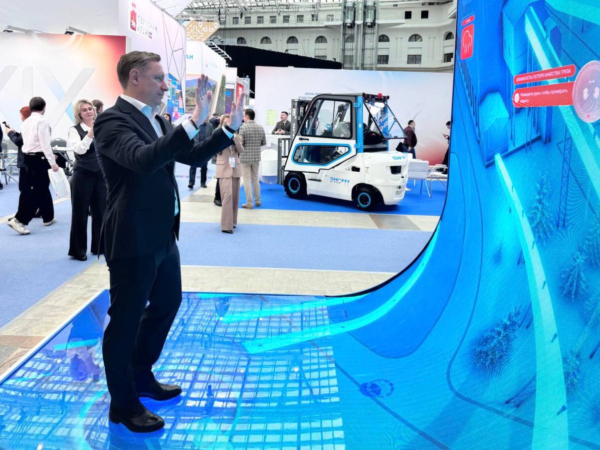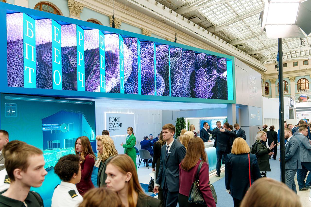 Центральным элементом экспозиции стенда Port Favor в Гостином дворе стал LED-экран, позволяющий каждому участнику поэтапно пройти всю технологическую цепочку погрузки.