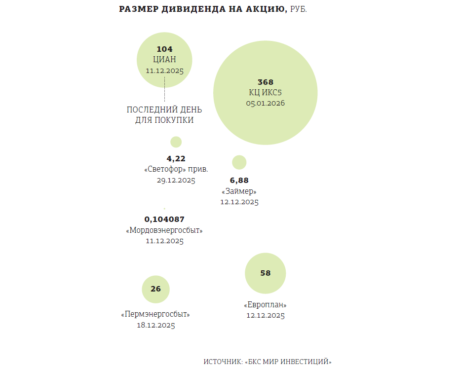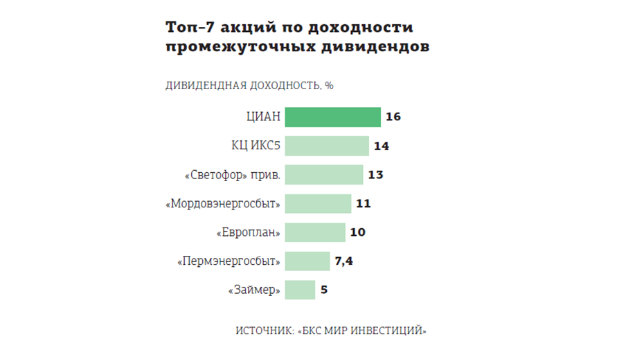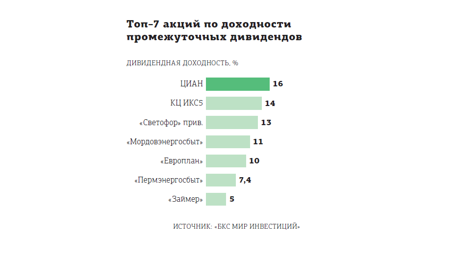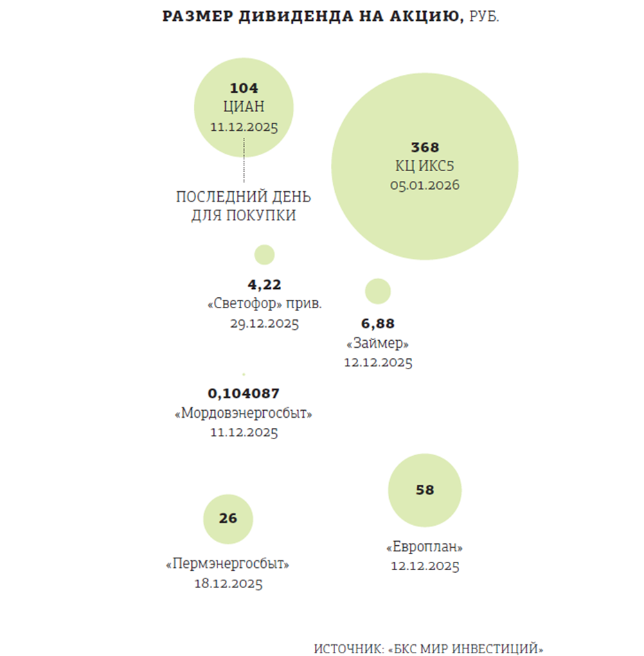 "В текущем дивидендном сезоне (выплаты за 9 месяцев, III квартал и спецдивиденды) наибольшую доходность (15,5%) на данный момент дают акции ЦИАН (спецдивиденд), за которыми следуют ИКС5 (13,6%) “Европлан” (10,2%), “Евротранс” (7,1%) и “Займер” (4,5%), — перечисляет аналитик ИК “Велес Капитал” Елена Кожухова. — Реестры акционеров для получения выплат по указанным эмитентам закрываются в декабре и первой половине января".