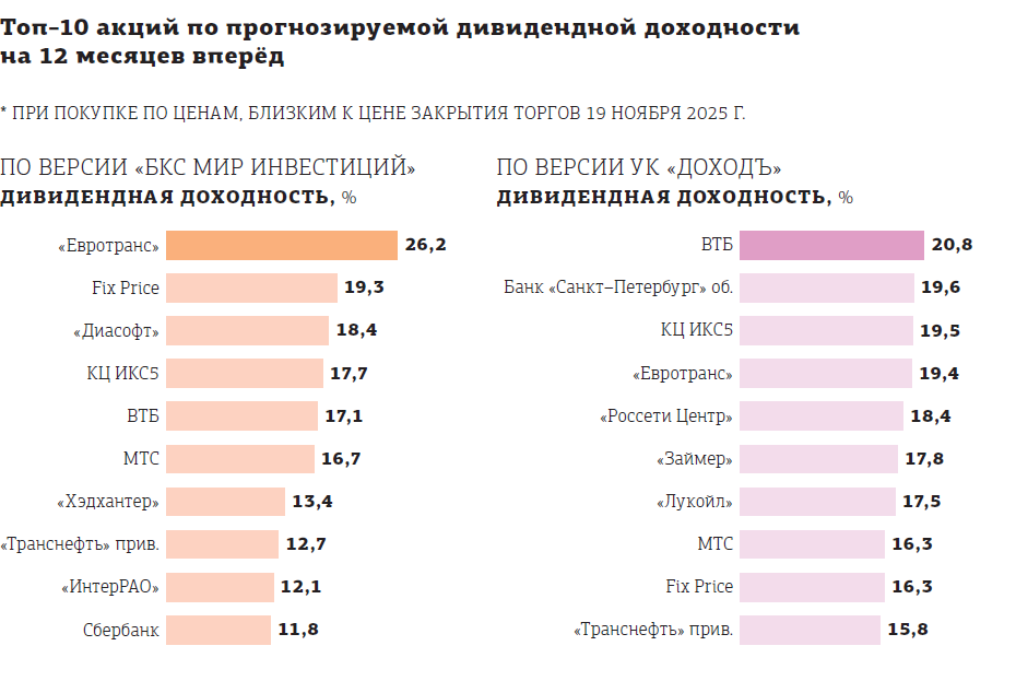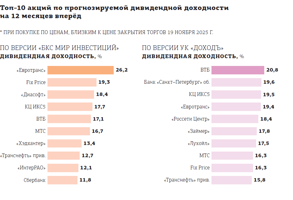 Наибольшую дивидендную доходность по состоянию на закрытие торгов 19 ноября 2025 года могут обеспечить акции ИКС5, МТС (около 17%), ЦИАН (до 22%), а также "Европлан" с ожидаемой доходностью около 10%. Общий объём дивидендных выплат российских компаний в 2026 году может превысить прошлогодний уровень с учётом снижения ключевой ставки до 16% и восстановления операционных показателей, при этом крупнейшими плательщиками традиционно останутся нефтегазовый сектор ("Сургутнефтегаз" с его привилегированными акциями), банки (Сбербанк) и крупные ретейлеры. Основные факторы, влияющие на дивиденды, — это геополитическая конъюнктура, решения Банка России по ключевой ставке, курс рубля, налоговое регулирование, а также потребности мажоритарных акционеров.