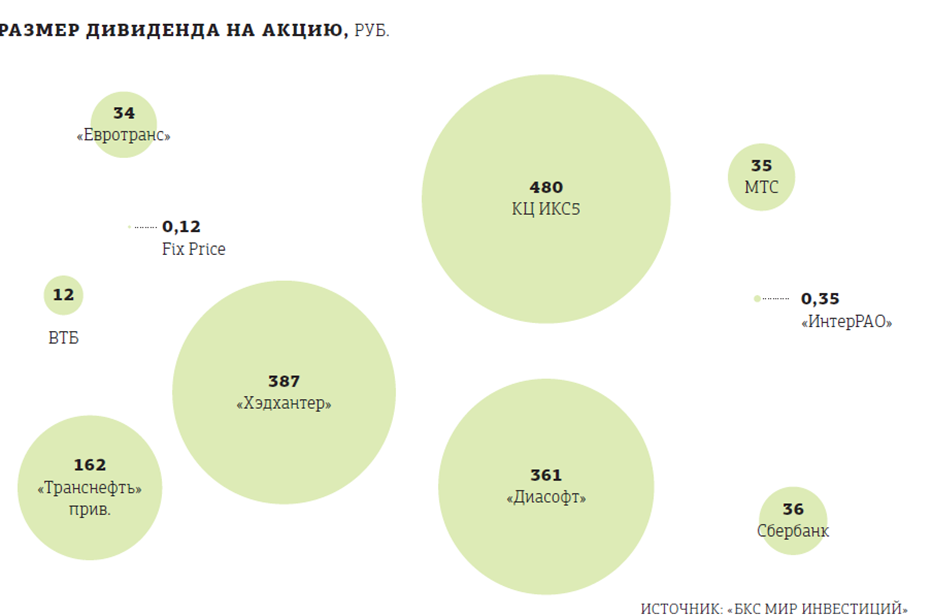 Например, портфельный управляющий УК "Первая" Михаил Цагарели относит к лидерам МТС, в дивидендах которых заинтересована АФК "Система". По его мнению, они заплатят фиксированный дивиденд 35 рублей на акцию, что транслируется более чем в 16% годовых. Общий совокупный объём дивидендов российских компаний в следующем году в УК "Первая" приблизительно оценивают в 2,8–2,9 трлн рублей. Традиционно самым крупным плательщиком выступит Сбербанк.